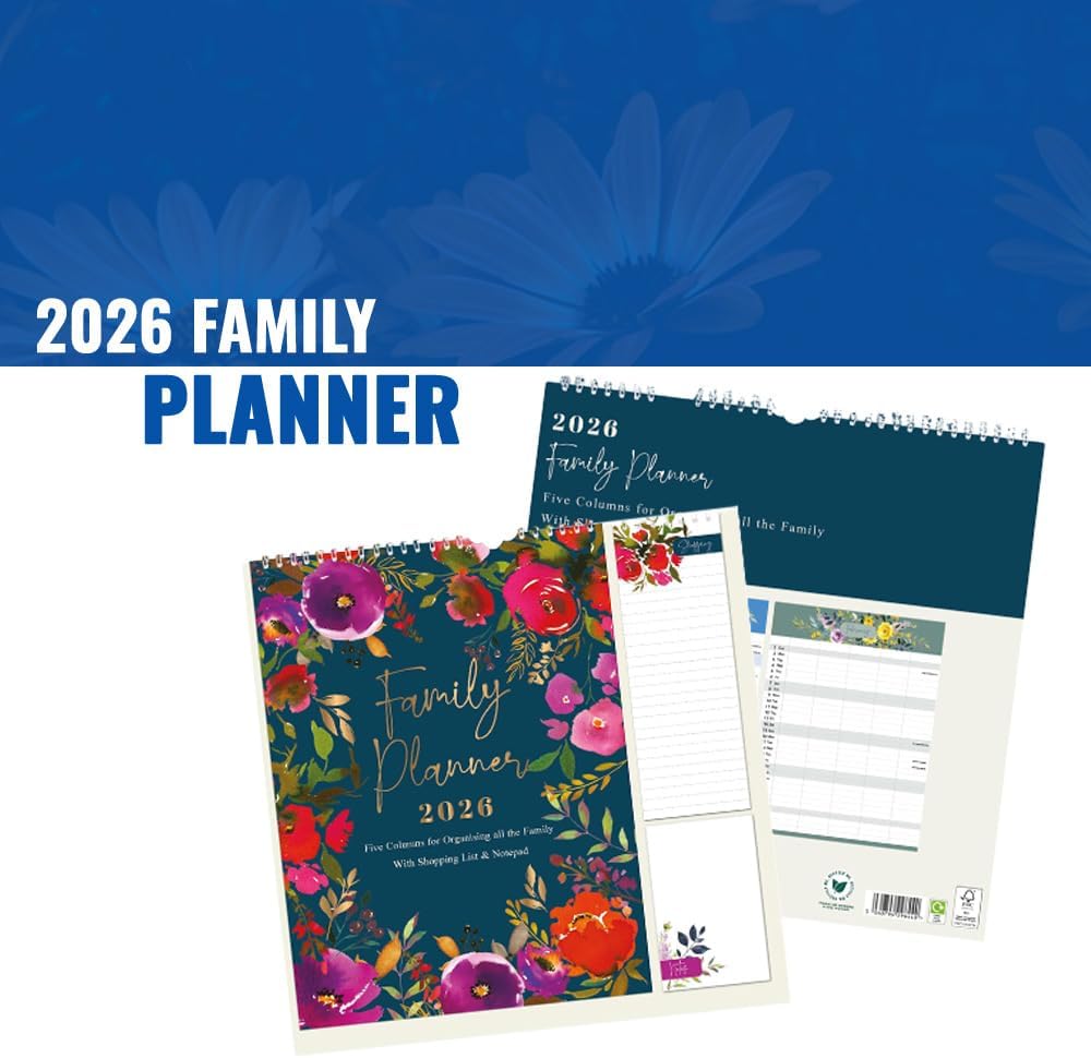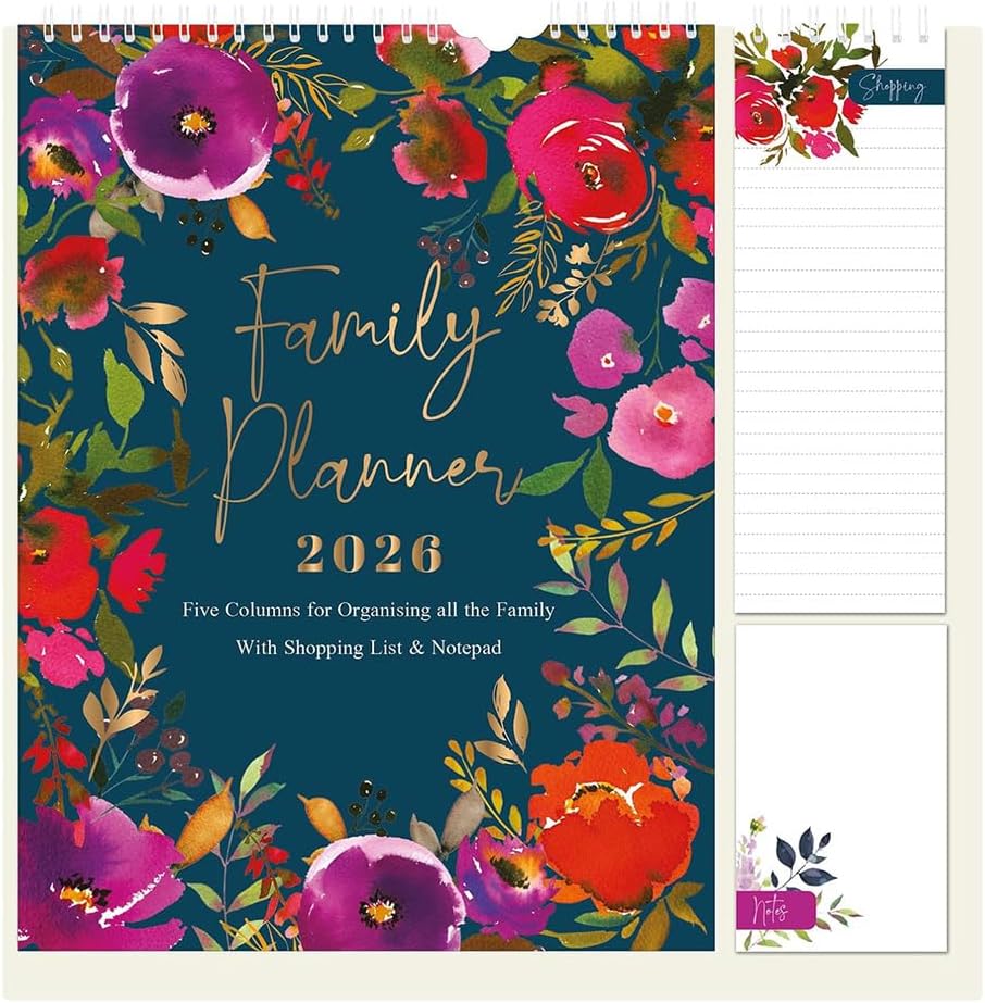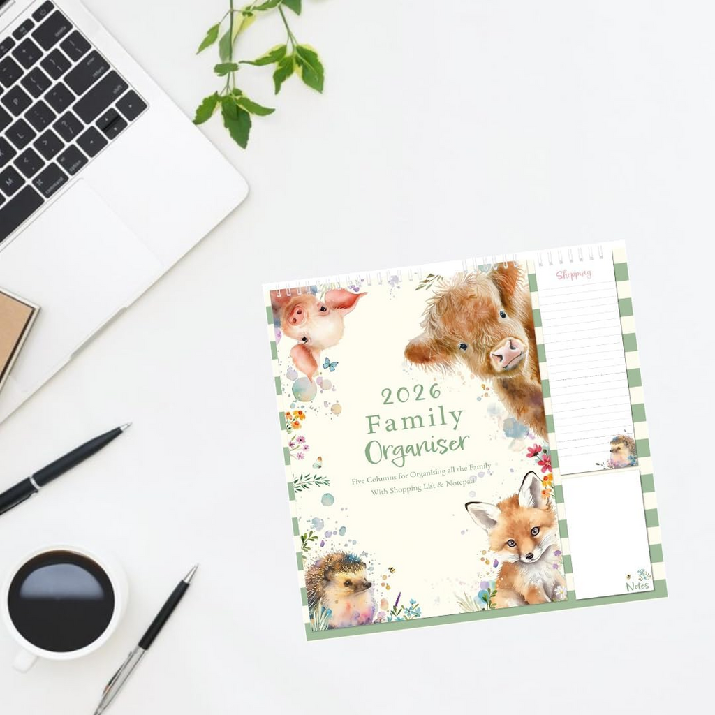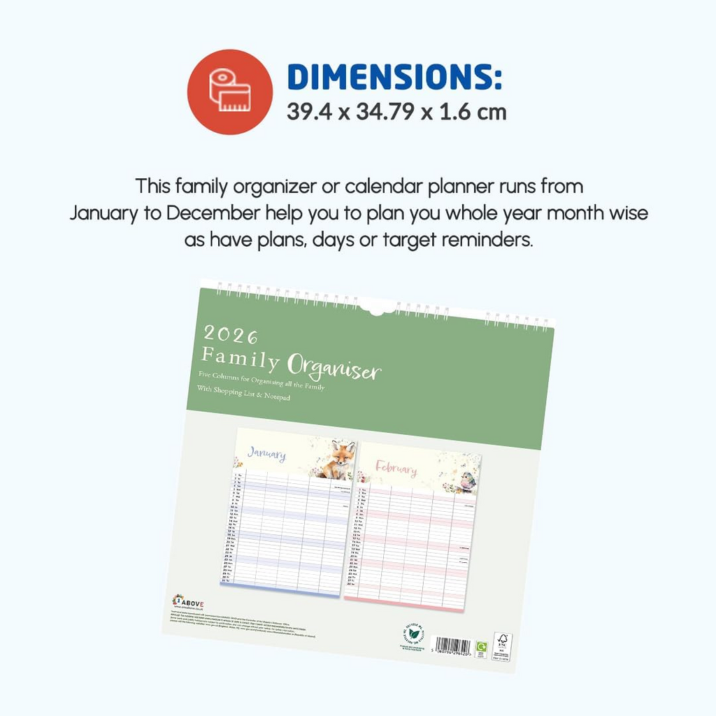 Stay organised in 2026 with the 1ABOVE Family Organiser Calendar. Designed with busy households in mind, this practical wall planner includes five columns per month—making it easy to track schedules for each family member. The included memo pad and shopping list add extra convenience, ensuring nothing gets forgotten. With stylish themes to choose from—Bees, Animal, Town, or Flower—it’s as decorative as it is functional.