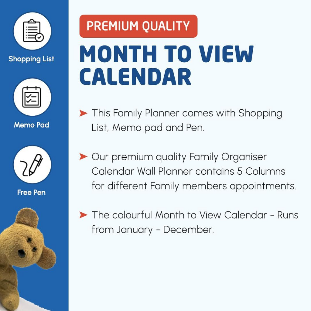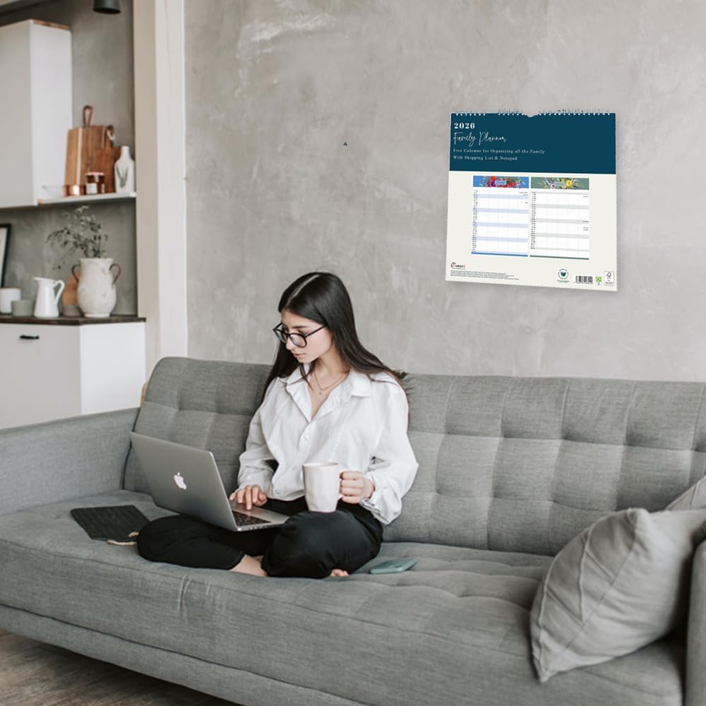 The 1ABOVE Family Organiser Calendar combines practicality with style, making it the ultimate household planner. With five columns, it helps families coordinate busy schedules with ease, while the added memo pad and shopping list keep tasks and groceries on track. Its month-to-view layout ensures clarity at a glance, and the choice of themes adds a decorative touch to your home. Reliable, functional, and designed for everyday use, it’s the perfect solution for keeping your family organised all year round.