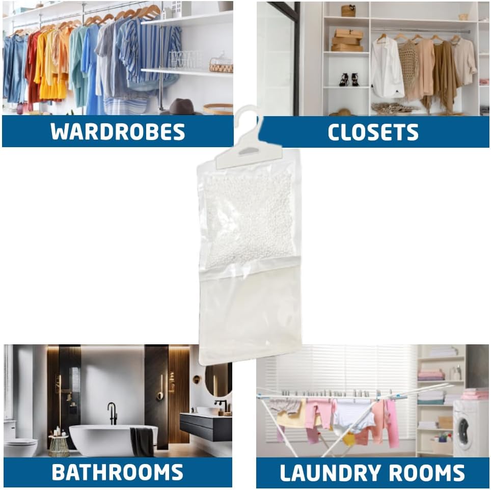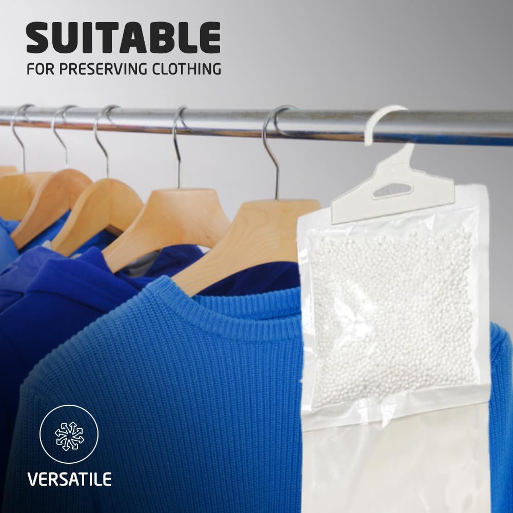 Protects Clothes & Stored Items: Helps preserve clothing, shoes, bags, and fabrics from moisture damage and odours.