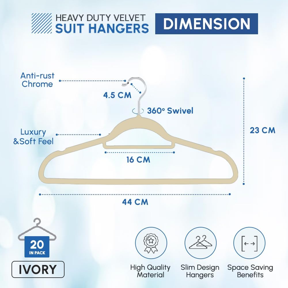 Organise your wardrobe with elegance and strength using the Premium Quality 50 Pack Velvet Hangers. Designed with a luxurious non-slip velvet finish, these heavy-duty suit hangers securely hold everything from delicate blouses to bulky jackets without slipping, creasing, or losing shape. With built-in tie bars, ultra-slim space-saving design, and 360° swivel hooks, these hangers are perfect for modern, clutter-free wardrobes.