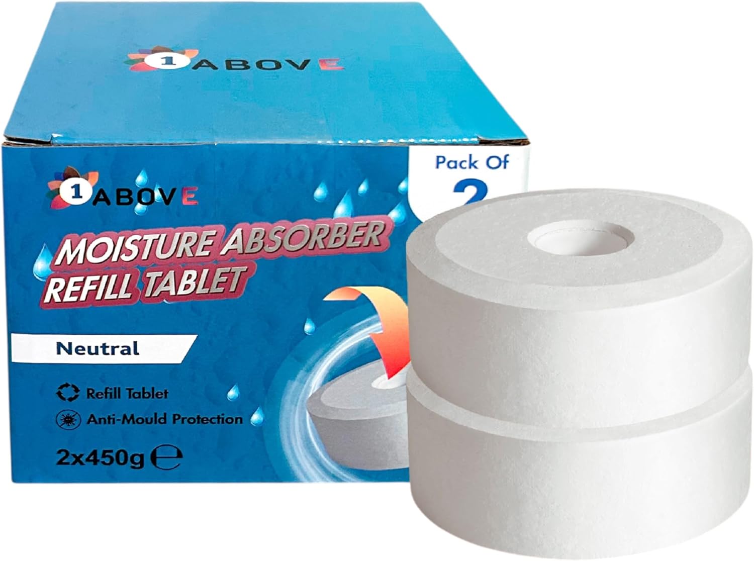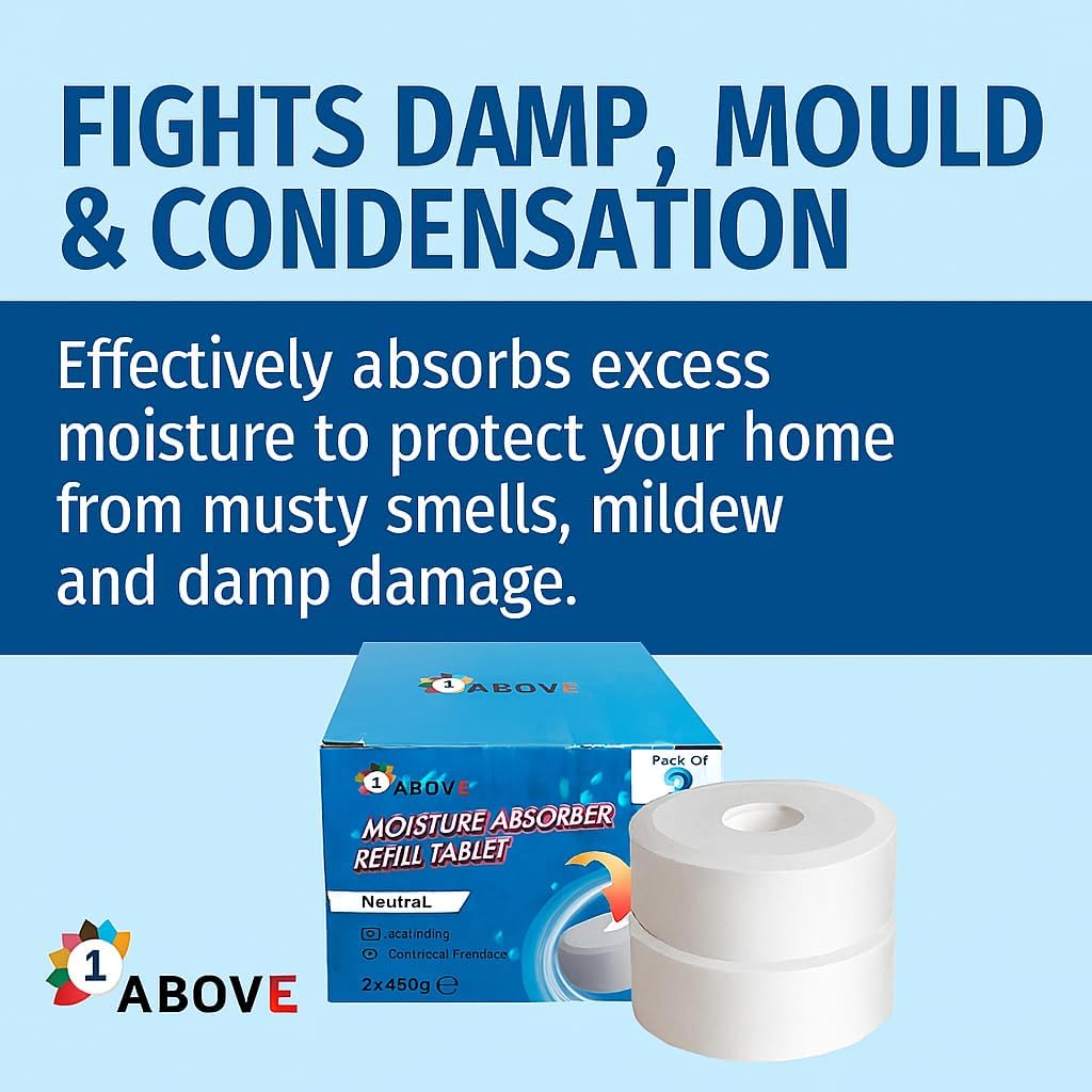 Maintain a fresh, dry, and healthy indoor environment with the 1ABOVE Dehumidifier Refill Tabs (2-Pack). Designed to fit most standard 450g dehumidifiers and 1L moisture traps, these high-performance refill tablets effectively absorb excess humidity, eliminate damp, prevent mould growth, and neutralise unpleasant odours. Ideal for home, office, garage, bathroom, wardrobes, and caravans, these refill tabs provide long-lasting moisture protection without using any electricity.