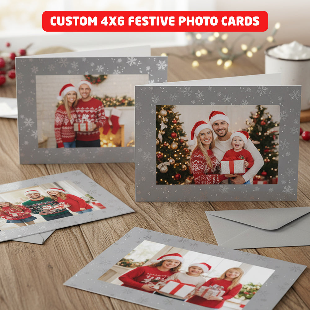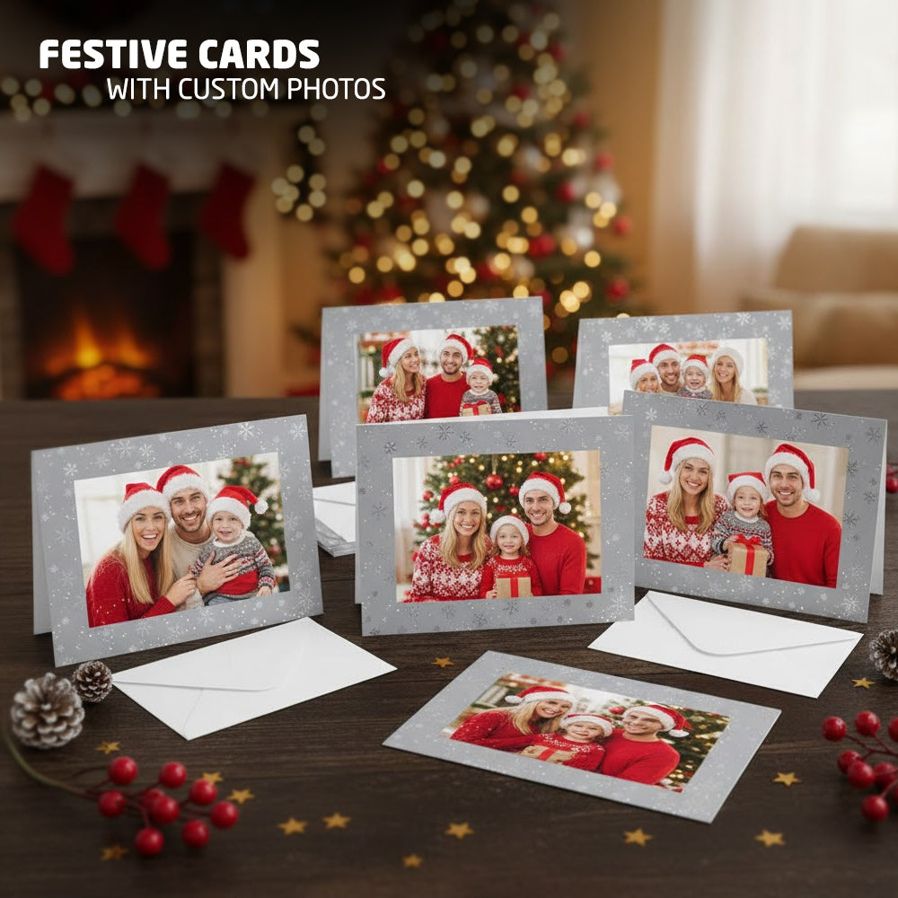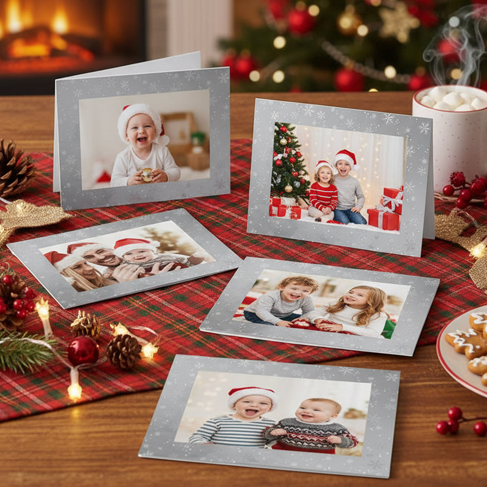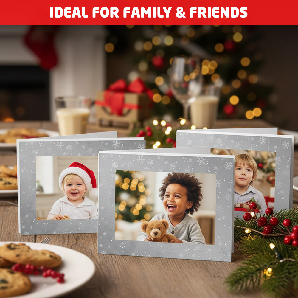 These 6 Pack Personalised Photo Frame Christmas Cards offer a unique way to turn a simple greeting into a lasting memory. Unlike standard Christmas cards, the built-in 4x6 photo frame allows you to share meaningful moments with your loved ones, making every card feel personal and heartfelt. The elegant silver festive design enhances your photo without overpowering it, while the lightweight yet premium build ensures easy posting and long-lasting keepsake value. Whether you’re sending family portraits, children’s photos, or favourite pet memories, these personalised cards create emotional connections that last far beyond the holiday season.
