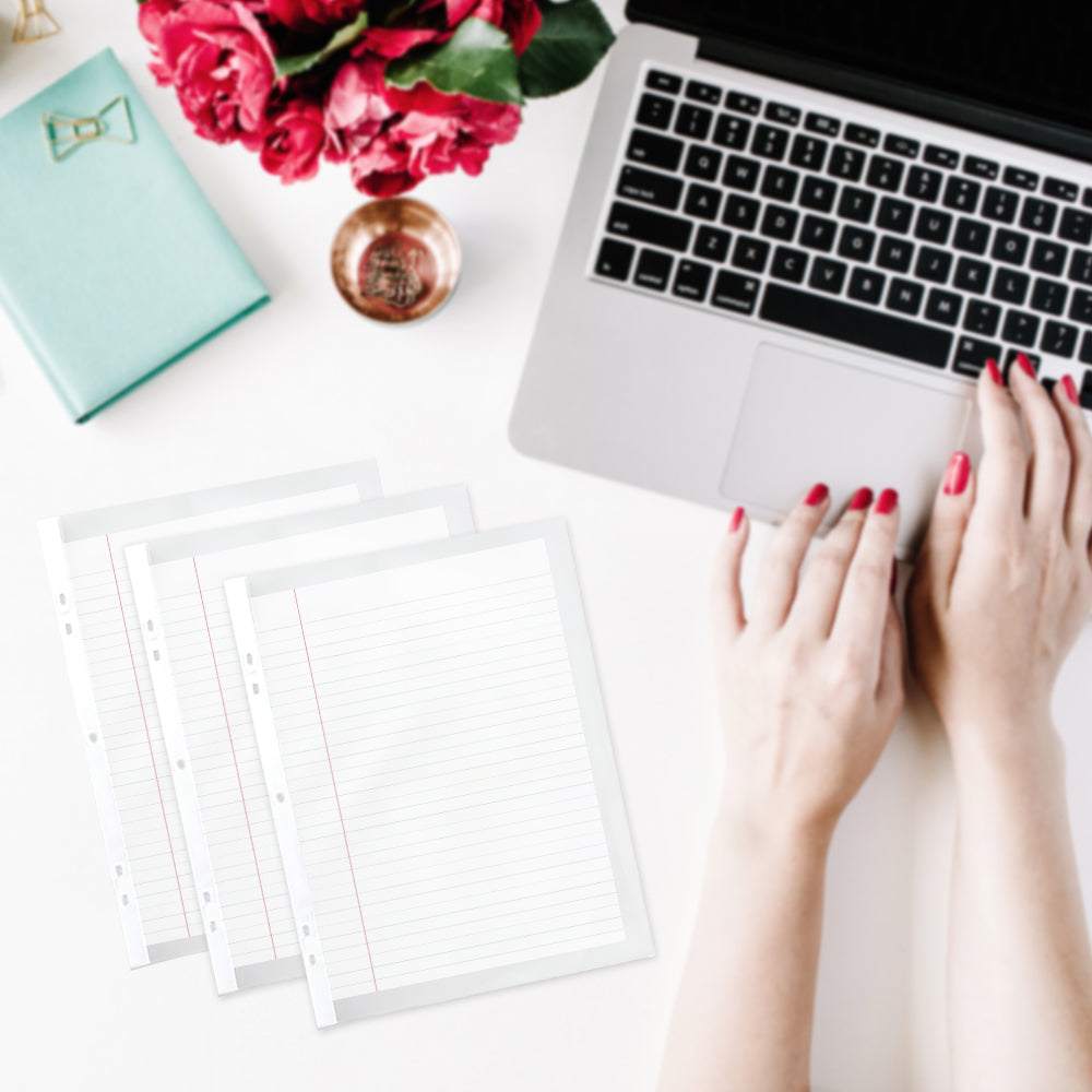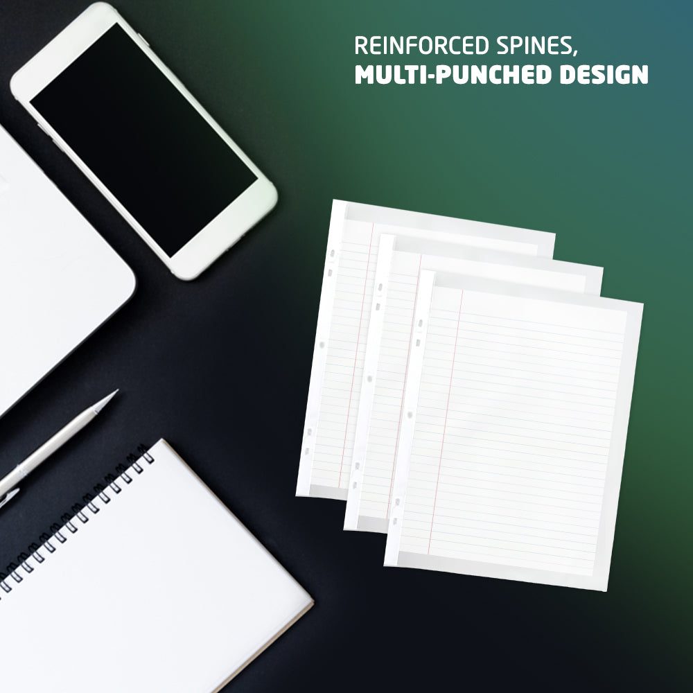 - Spines are reinforced with green strip + multi-hole punched to fit any filing or portfolio system