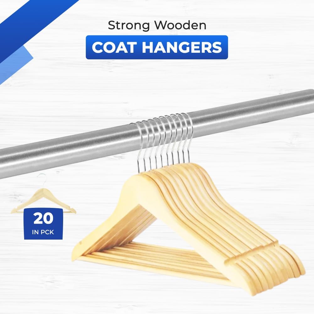 Each pack includes 20 premium wooden hangers, providing great value for home wardrobes, businesses, or retail outlets.