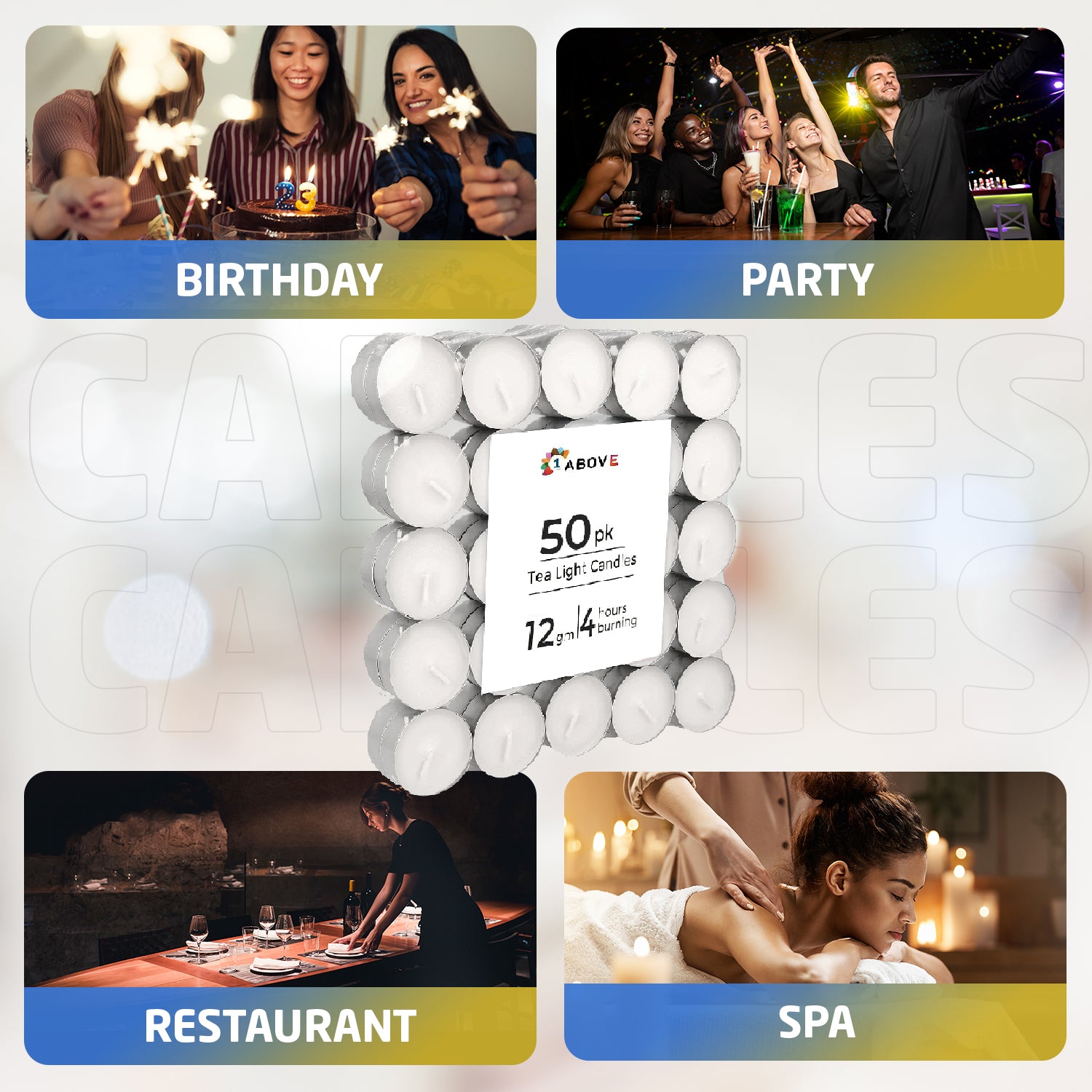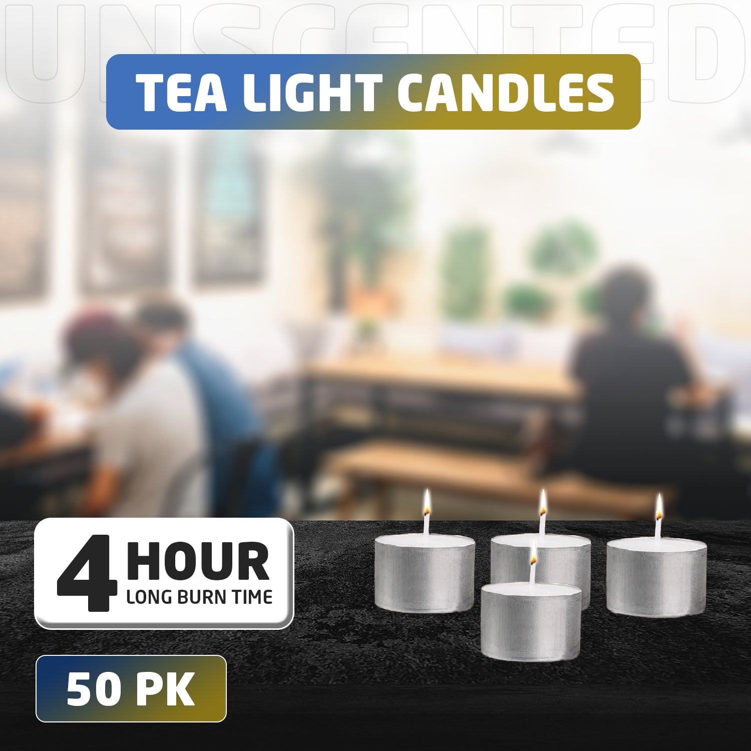 Create a warm and inviting atmosphere with the 1ABOVE Unscented Tea Light Candles (50 Pack) – perfect for enhancing the ambiance at weddings, birthdays, parties, restaurants, spas, and other special events. Designed for a clean and consistent burn, these high-quality tea lights provide up to 4 hours of illumination per candle, making them a reliable choice for both personal and professional use.